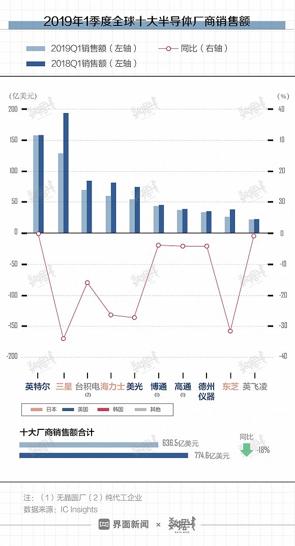 半导体市场研究机构Ic Insights不久前发布了2019年一季度全球半导体市场报告。全球十大半导体厂商销售业绩均出现不同程度下滑,销售总额同比下降18%。英特尔反超三星半导体,重回全球半导体厂商第一宝座。