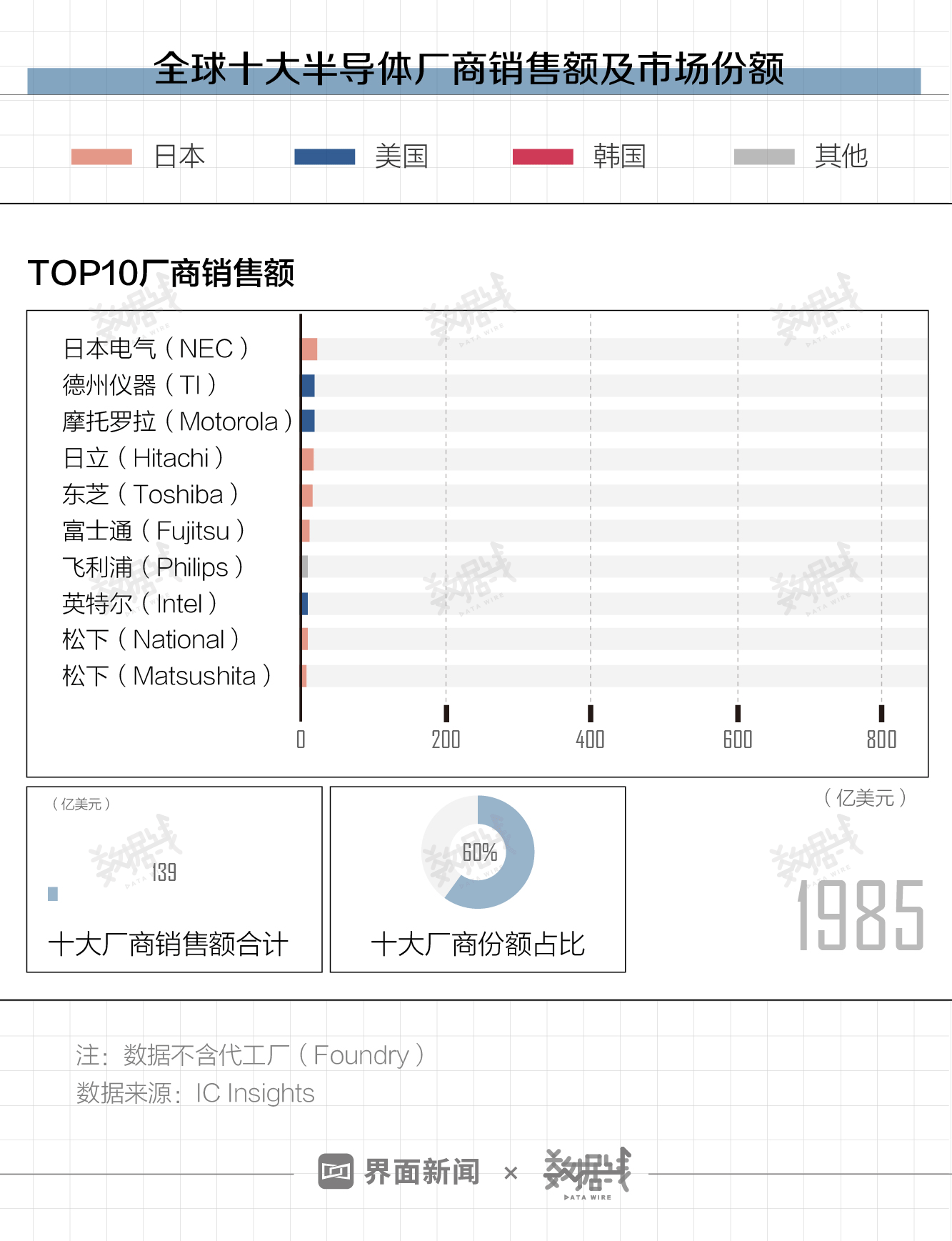1980年代中期,日本企业一度在全球十大半导体厂商排名中占据半壁江山。1985年后日本半导体行业由盛转衰,美国企业重新主导全球半导体行业。
