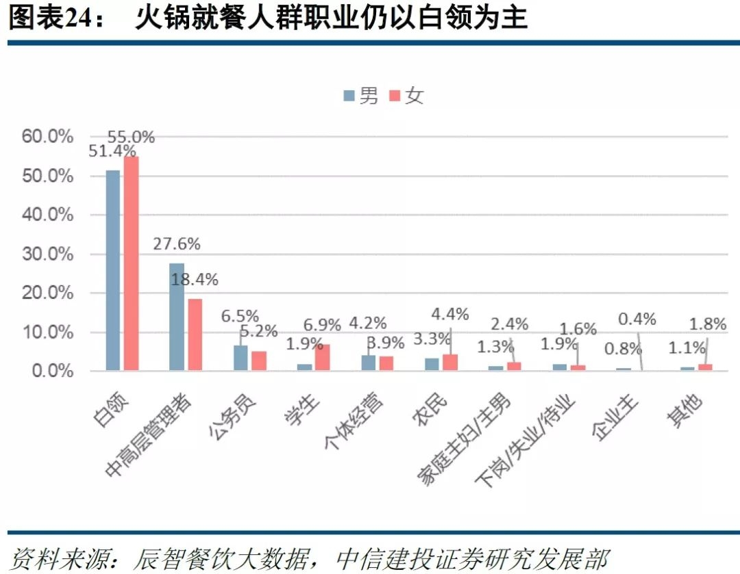 从受众职业来看,50%以上的火锅消费者为白领。由于传统火锅社交属性较强,交流氛围热烈,中高端火锅正逐渐成为商务聚餐的新趋势。