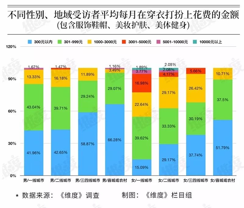 不难想象,受访者中的女性花费更猛。有1.43%的女性受访者每月在穿衣打扮上的消费,甚至超过了自己到手收入的100%,意味着她们为了美丽已经入不敷出。