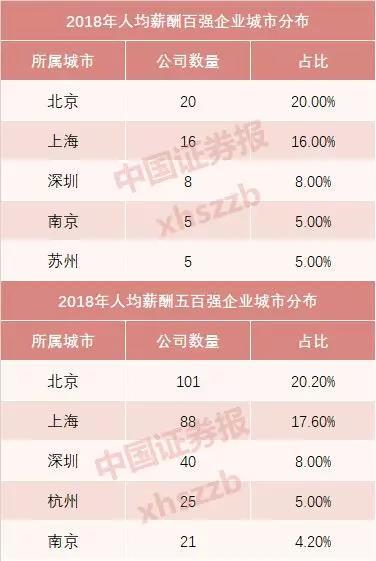 在地域上,2018年人均薪酬排在前100位的上市公司主要分布在北京、上海、深圳、南京、苏州;2018年人均薪酬排在前500位的上市公司主要分布在北京、上海、深圳、南京。