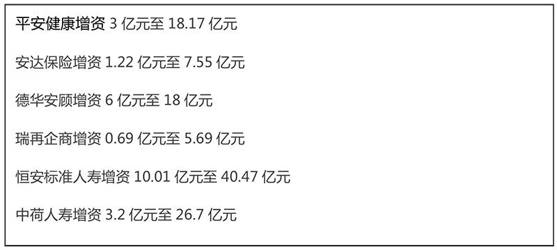 二是增资金额相对不小。除了瑞再企商外,增资额均在1亿元以上。年保费收入30多亿元的恒安标准人寿,更是一口气增资10亿元。
