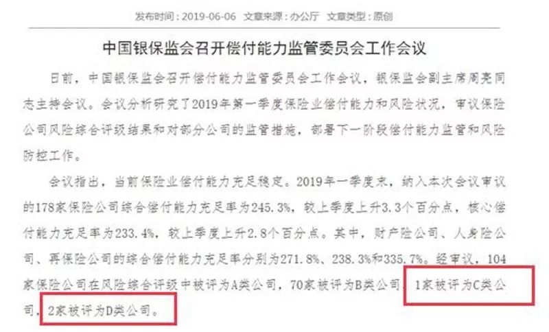 104家保险公司在风险综合评级中被评为A类公司,70家被评为B类公司,1家被评为C类公司,2家被评为D类公司。