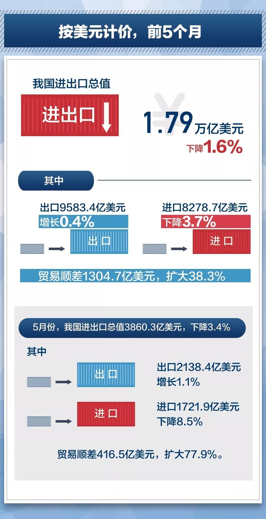 海关统计显示,今年前5个月,我国外贸进出口12.1万亿元,同比增长4.1%,其中出口6.5万亿元,同比增长6.1%,进口5.6万亿元,同比增长1.8%。