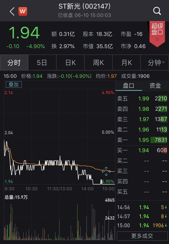 当日,ST新光开盘下跌,问询函披露后,下午,ST新光股价跌停,收报1.94元。