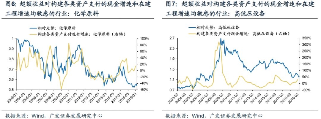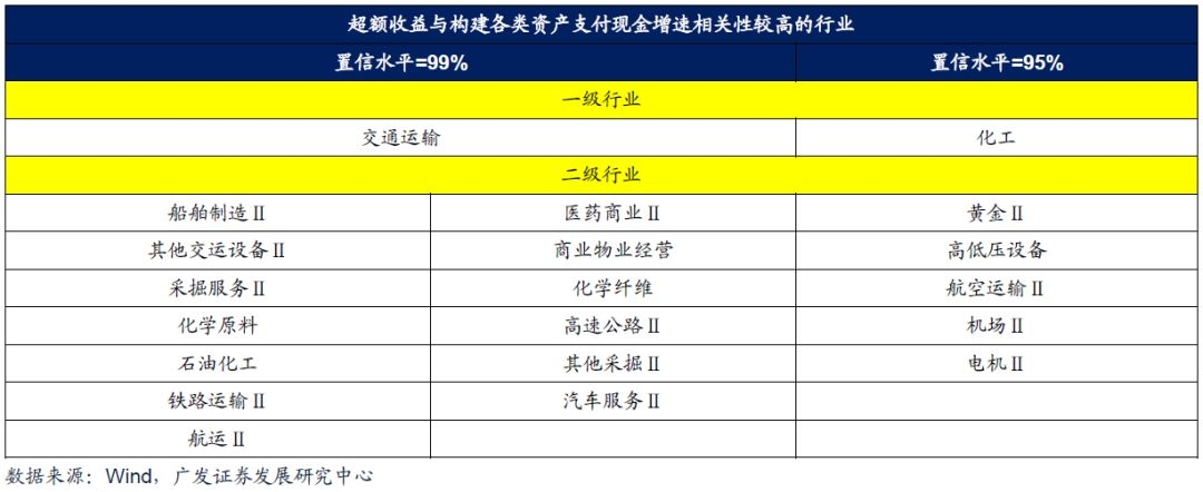 行业超额收益与构建各类资产支付的现金同比增速显著相关的细分行业:置信水平为99%的一级行业有交通运输共计1个,二级行业有化学原料、船舶制造、采掘服务等13个;置信水平为95%的一级行业有化工共计1个,二级行业有高低压设备、电机、航空运输等5个。(具体行业详见文末附表)