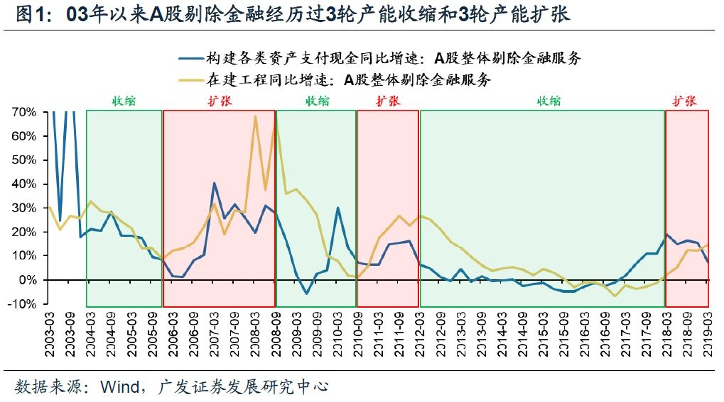 2003年以来,A股共经历过3轮产能扩张周期。(1)05Q4至08Q3,A股剔除金融的在建工程增速由低点的8.5%扩张至68.5%,提升幅度为60个百分点,产能扩张历时11个季度;(2)10Q3至12Q1,在建工程增速由1.3%升至26.9%,抬升幅度为25.6个百分点,扩张时长6个季度;(3)18Q1至19Q1,在建工程增速在4个季度内由2.4%提升至14.9%,扩张幅度为12.5个百分点。