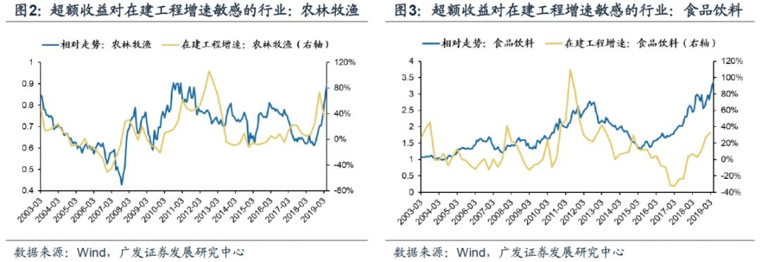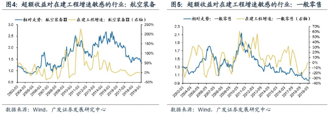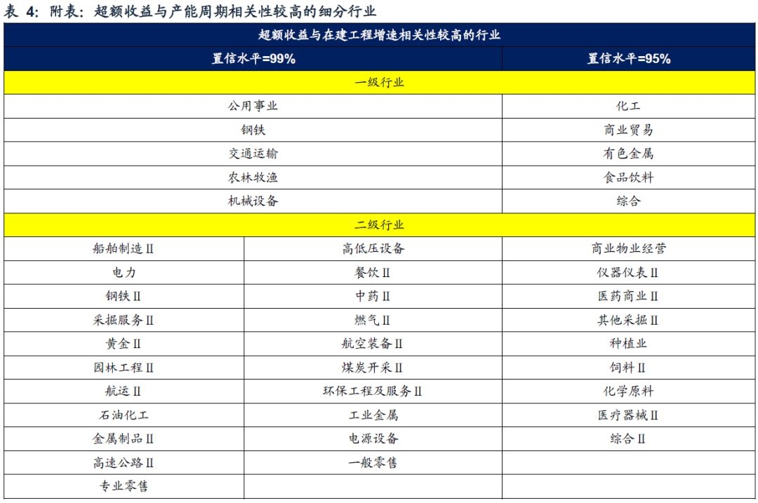 行业超额收益与在建工程同比增速显著相关的细分行业:置信水平为99%的一级行业有公用事业、钢铁、交通运输、农林牧渔、机械设备等5个,二级行业有高低压设备、航空装备、一般零售等21个;置信水平为95%的一级行业有化工、商业贸易、有色金属、食品饮料、综合等5个,二级行业有化学原料、医疗器械、仪器仪表等9个。