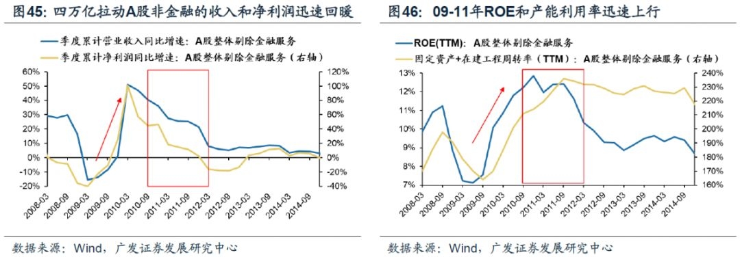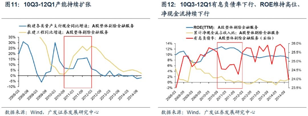 10Q3-12Q1期间,利润表各项指标在基建和地产投资拉动下均脉冲式改善。经济下行压力较大背景下,“四万亿”计划充分释放基建作为内需调节器的潜力,叠加宽松的地产政策,推动A股剔除金融的收入和净利润迅速回暖,ROE、产能利用率也快速上行至历史高位。
