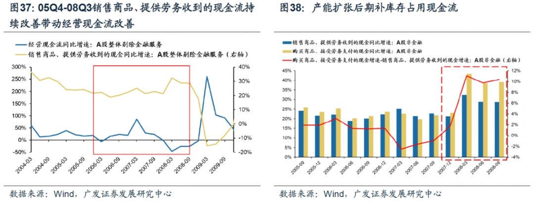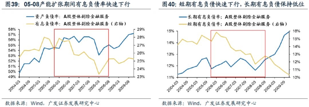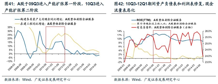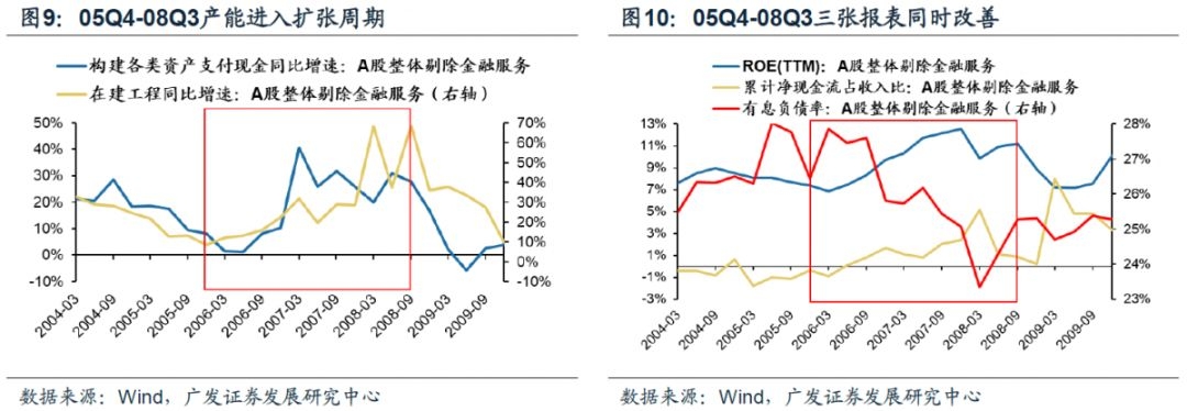 05年底开启的产能扩张周期伴随着利润表、资产负债表和现金流量表三张报表的同时修复。在出口和地产双重景气背景下,05Q4-08Q3A股剔除金融产能持续扩张。扩张期间A股剔除金融的ROE触底回升,有息负债率持续下行,净现金流占收入比由负转正且持续改善,三张报表均得到了改善。