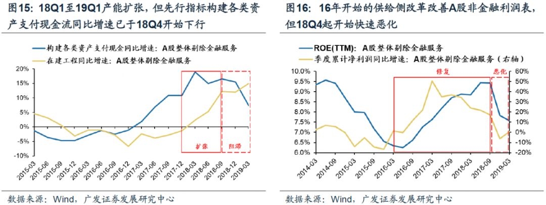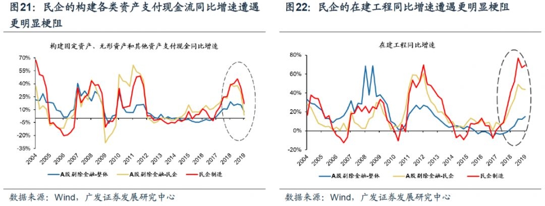 18Q4起,受到现金流量表和利润表双重恶化拖累,当前产能扩张遭遇阻滞,本轮产能扩张或已结束。由于销售利润率和资产周转率双双下行,A股剔除金融的ROE自18Q4起连续两个季度快速恶化。而现金流量表在18年“紧信用”环境下进一步恶化,销售商品、提供劳务收到的现金增速快速下行,筹资现金流增速持续负增长。在现金流量表和利润表的迅速恶化下,18Q4起A股剔除金融的构建各类资产所支付的现金增速已连续回落2个季度,在建工程增速的上行斜率也受到阻滞,本轮产能扩张或已结束。“春江水暖鸭先知”,民企作为经济体中最敏感的神经末梢,构建各类资产支付现金流同比增速的回落更为明显,在建工程增速也已先于A股剔除金融,在18Q4出现向下拐点。