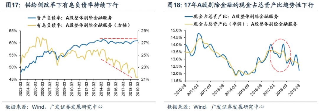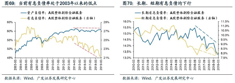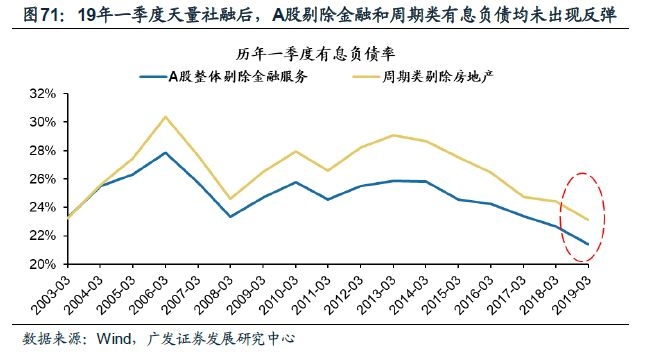 5.4 有息负债率处于历史低位,19Q1天量社融后仍保持下行趋势,未来快速恶化概率不大