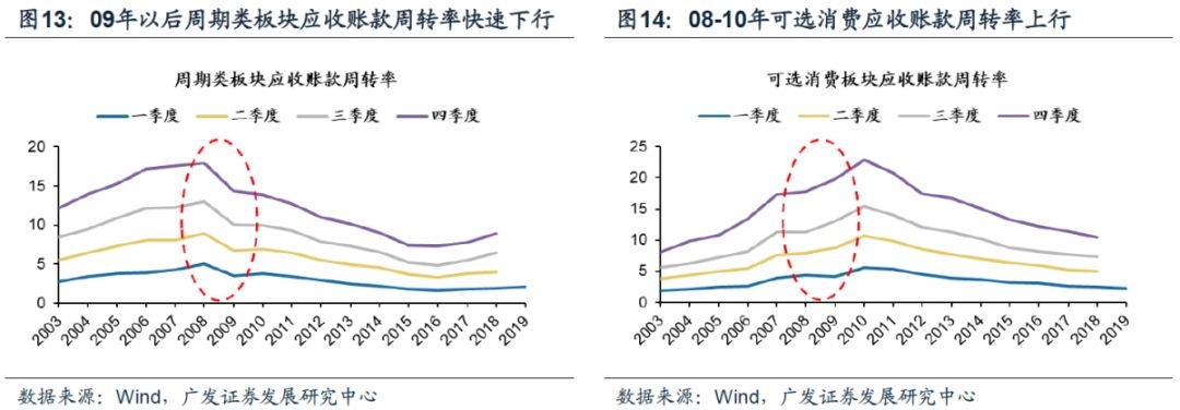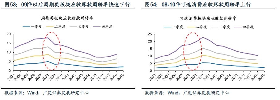 但经营现金流的恶化源于周期类行业基建项目应收账款账期的延长。“四万亿”下,板块间应收账款回款能力分化:周期类板块因政府项目占比提高,应收账款账期延长,09年应收账款周转率快速下行,回款能力下降;而期间可选消费、必需消费的应收账款周转率则呈上行趋势。因此A股剔除金融应收账款周转率的恶化主要源自于周期类板块。由于政府项目应收账款天生具备“高信用”,转化为未来经营现金流的概率较大,现金流量表的恶化得到了“补偿”,因此也可视作现金流量表的修复。