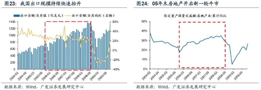 2005年末,在出口规模持续快速扩张,地产投资重燃活力的背景下,产能扩张开启。2001年入世以来,我国出口增速快速抬升,对外贸易逐渐成为推动经济增长的重要动力。2005年至2008年,我国出口金额自7620亿美元快速增长至14307亿美元,增幅高达88%,复合增长率高达23.4%;而货物和服务净出口对GDP的贡献率则由2004年的-4.2%快速攀升至2005年的12.5%,并随后连续3年高于10%。地产方面,2005年8月国务院发布《关于促进房地产市场持续健康发展的通知》,开启新一轮地产牛市,地产投资重燃活力,房地产投资增速于05年末触底后开始持续回升。在出口+地产双重扩张下,上市公司开始新一轮产能扩张,A股剔除金融的在建工程同比增速由05Q4的8.5%快速上行至08Q3的68.5%,产能扩张历时11个季度。