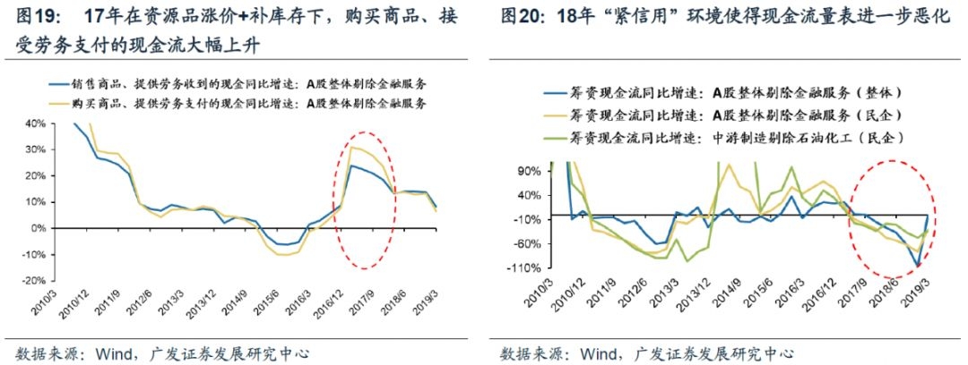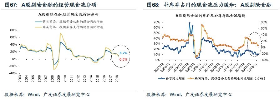 19Q1经营现金流改善的主因为补库存占用现金流的压力缓和,是“被动改善”,其实质性改善需要等待销售商品、提供劳务收到的现金流同比增速回升。A股剔除金融的经营现金流的流入端仍在回落——19一季报销售商品、提供劳务收到的现金流同比增速仅为8.2%,相对18年报的13.9%显著回落;而经营现金流的流出端回落的幅度更大——19一季报购买商品、接受劳务支付的现金流同比增速只有6.5%,相对18年报的13.2%大幅回落。库存周期尾声(去库存后半程),企业的库存增速持续回落,补库存对经营现金流的占用压力缓和,是A股剔除金融经营现金流改善的主要原因。经营现金流的实质性改善需要等待流入端,即销售商品、提供劳务收到的现金流同比增速的重新回升。