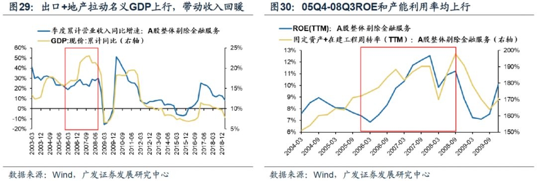 05-08产能扩张期间,利润表在出口链和地产链带动下内生性改善。“出口+地产”双轮驱动拉动名义GDP高速增长,从而拉动A股剔除金融的收入增速在高基数下继续上行,自06Q1的19%上升至08Q3的30%。收入改善带动产能利用率(固定资产+在建工程周转率)不断提高。A股剔除金融的ROE于16Q1触底后向上快速改善,由06Q1的6.9%升至08Q3的11.2%。
