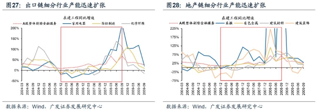 在出口和地产双重刺激下,本轮产能扩张伴随着三张报表的同时修复。从利润表角度看,A股剔除金融的ROE于06Q1触底后持续回升改善。伴随盈利稳步改善,企业开启资产负债表的自发性修复,有息负债率趋势性持续回落。同时,A股剔除金融的净现金流于06Q2由负转正,累计净现金流占收入比快速抬升,现金流量表改善。在此期间,出口链、地产链相关细分行业的产能扩张更为突出。出口链中的家用电器、纺织服装、化学纤维和地产链中的采掘、有色金属、建筑材料、建筑装饰等行业的在建工程增速扩张速度和斜率均明显大于A股剔除金融的平均水平。