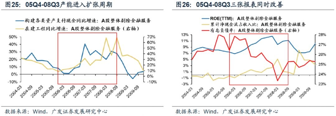 在出口规模持续快速扩张,地产投资重燃活力的背景下,A股剔除金融自05Q4起持续进行产能扩张,历时11个季度。扩张期间A股剔除金融的ROE触底回升,有息负债率持续下行,净现金流占收入比由负转正且持续改善,三张报表均得到了修复。