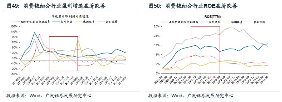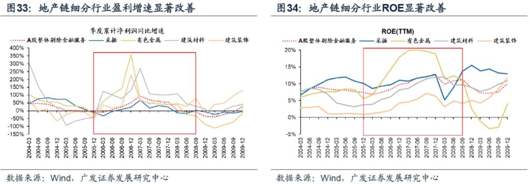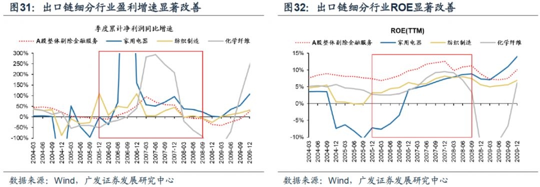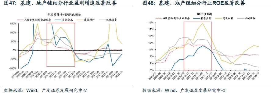 出口链和地产链相关行业的盈利改善更为明显。出口链中,家用电器、纺织服装、化学纤维等行业在本轮产能扩张期间的盈利增速和ROE提升幅度基本均大于A股剔除金融的平均改善幅度。地产链中,采掘、有色金属、建筑装饰、建筑材料等行业在本轮产能扩张期间的盈利增速和ROE的改善幅度基本均好于A股剔除金融的平均修复幅度。