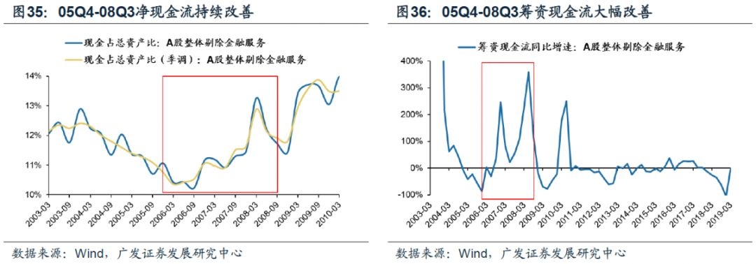 06Q1起A股剔除金融现金流量表持续改善。A股剔除金融的现金占总资产比于06Q1触底后不断抬升,净现金流持续改善。筹资现金流则自05Q4触底回升,于06Q3由负转正后进入极高速增长。