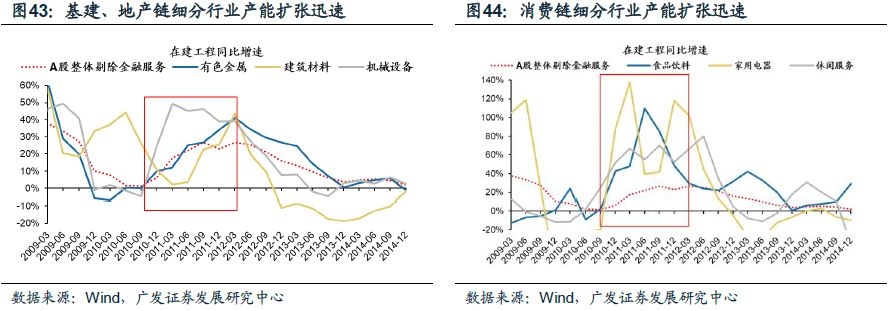 本轮产能扩张主要表现为基建链和地产链快速扩张,同时带动消费复苏。基建、地产链中的有色金属、建筑材料、机械设备和消费链中的食品饮料、家用电器、休闲服务等行业的在建工程同比增速扩张速度和斜率均显著高于A股剔除金融的平均水平。