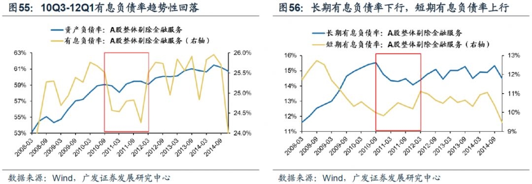 10Q3-12Q1产能扩张期间,A股剔除金融的资产负债表整体改善。有息负债率震荡趋势性回落;从负债结构来看,长期有息负债率下行,短期有息负债率上行。