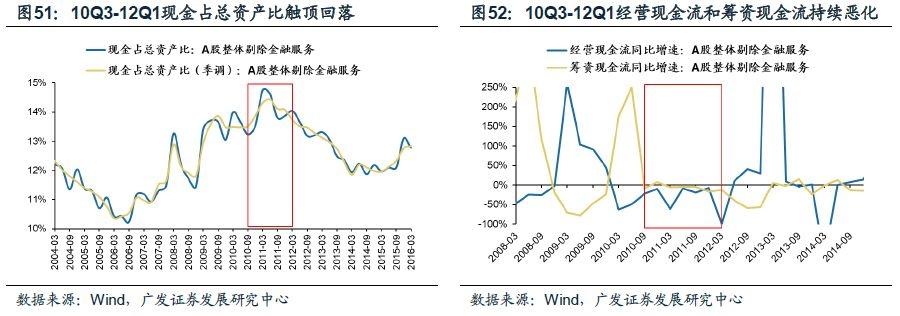 整体来看,09-12年产能扩张期间现金流量表呈现微幅“恶化”趋势的主要原因是经营现金流的持续大幅度负增长。产能扩张期间,A股剔除金融的现金占总资产比于11Q1触顶后快速回落;经营现金流同比增速自09Q1触顶后快速回落,并于10Q1由正转负,随后连续2年较大幅度的负增长;扩张期间的筹资现金流虽始终保持负增长,但负增长幅度较小。