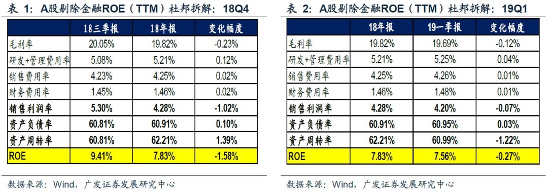 销售利润率和资产周转率分别是18Q4和19Q1的ROE回落的主要原因。杜邦拆解来看:18年报销售利润率拖累ROE——销售利润率从18Q3的5.3%大幅回落到18年报的4.3%,显著回落了1.02%;19一季报资产周转率拖累ROE——资产周转率从18年报的62.2%大幅回落到19一季报的60.1%,显著回落了1.22%。