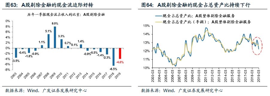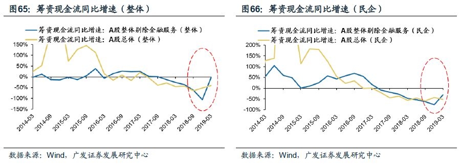 “金融供给侧改革”助力19年筹资现金流改善。在“民企纾困”、“金融供给侧改革”下,信用环境“由紧转松”,筹资现金流最差的时候已经过去。19一季报A股剔除金融筹资现金流同比增速-1.4%,相对于18年报的-105.9%大幅改善。但民企上市公司的筹资环境改善幅度相对较弱,19一季报A股剔除金融民企上市公司筹资现金流同比增速-29.6%,相对于18年报的-75.9%有所改善,但仍处于大幅负增长区间。疏通企业信用渠道是19年“金融供给侧改革”的重要部分,A股上市公司的筹资现金流有望得到持续的改善。