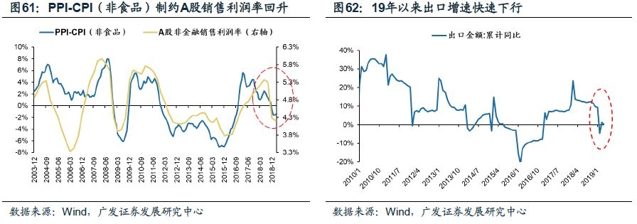 PPI-CPI(非食品)和出口增速下行或将制约ROE回升。在宏观总需求趋势性抬升的迹象出现之前,工业品价格缺乏大幅改善的动能,因此PPI-CPI(非食品)将制约A股非金融的销售利润率修复。美国加征关税则抑制出口增速反弹,制约A股非金融的资产周转率回升。