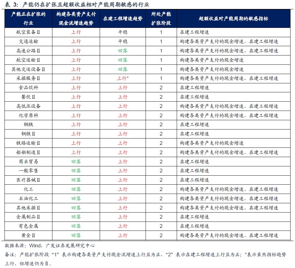 当前A股整体产能扩张周期已现颓势,但有部分行业仍在进行产能扩张,从而提供了结构性的投资机会。我们筛选了超额收益对产能周期较为敏感且构建各类资产支付现金流增速或在建工程增速仍在快速上行的行业,其中一级行业包括食品饮料、商业贸易、交通运输、化工等共6个,二级行业包括航空装备、餐饮、化学原料等共17个。从持续性看,当前构建各类资产支付现金流增速仍在上行的行业预计有更强的持续性,而增速已开始回落的行业则面临产能扩张结束的压力。
