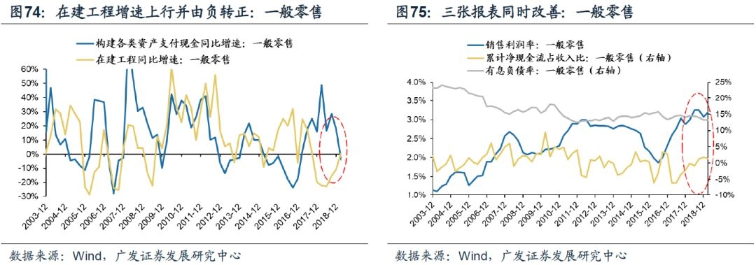 三张报表同时改善助推部分细分行业的内生性产能扩张。当前正处在产能扩张周期的行业中,食品饮料的ROE高位平稳,现金流持续上行,有息负债率趋势性下行;一般零售的销售利润率居历史高位,现金流回暖,有息负债率处于历史低位。