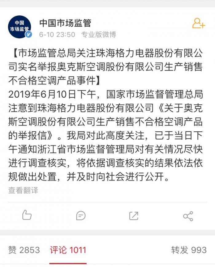 针对格力电器在官微上公开举报奥克斯生产销售不合格空调产品,并随后公开八份检测报告一事,已经引起国家市场监督管理总局的高度重视。