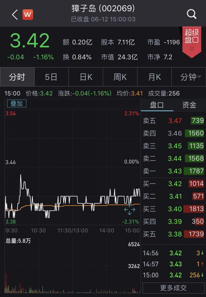 6月12日,獐子岛收报3.42元,与2018年一月末时的股价相比下跌56%,市值则蒸发31亿元。