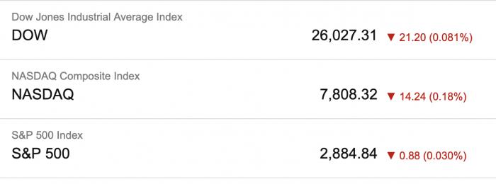 美东时间6月12日,美股未能延续之前连涨的趋势,三大股指开盘后全部走低。截至记者发稿,道琼斯指数开盘报26037.55点,微跌0.04%;标普500指数开盘报2882.73点,下跌0.1%;纳斯达克指数开盘报7803.73点,下跌0.24%。