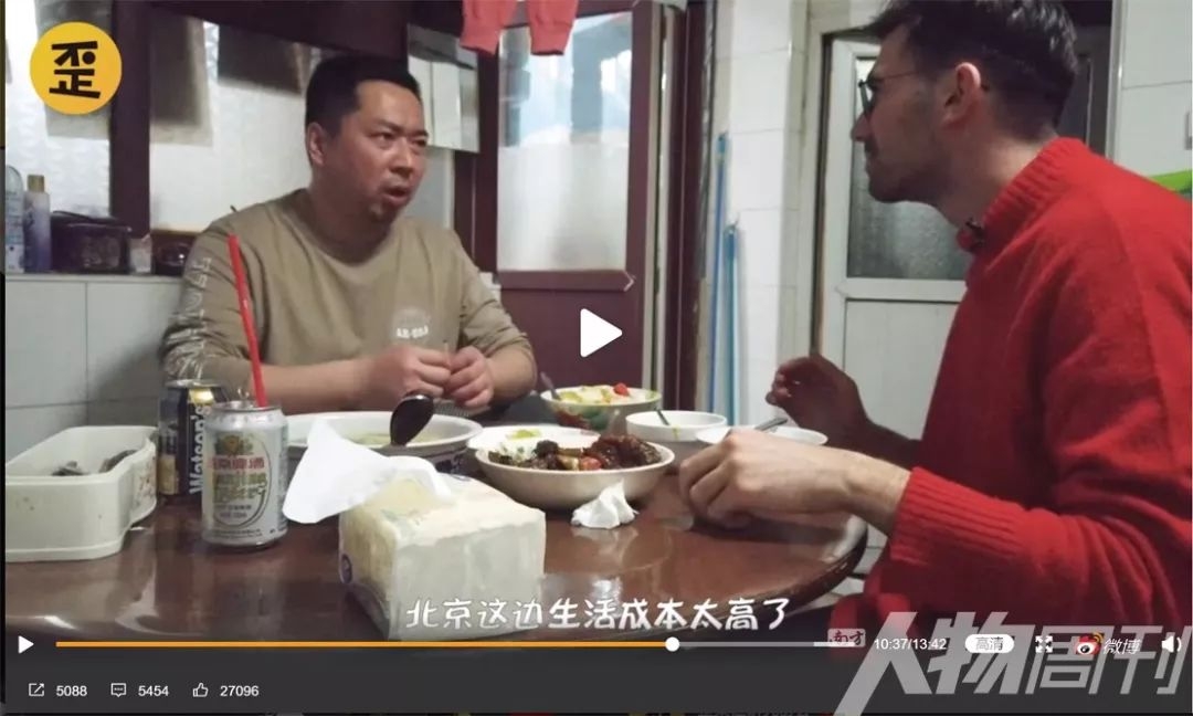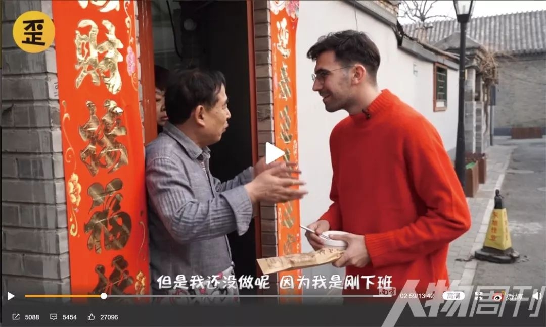 这些评论针对的是“歪研会”一则新更的视频——《外国人在中国随机敲门蹭饭,真的有人给他开门吗》。视频中,只拿着一碗一筷的高佑思,从北京帽儿胡同出发,接连碰壁数十次后,最终被一对父子接纳。在一处并不宽敞的胡同房里,他和主人一家一起享用了一顿两菜一汤的家庭晚餐。