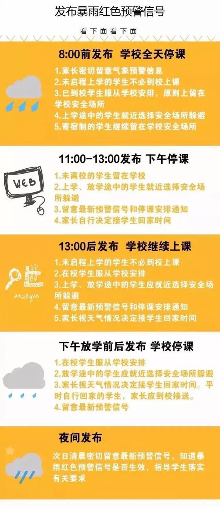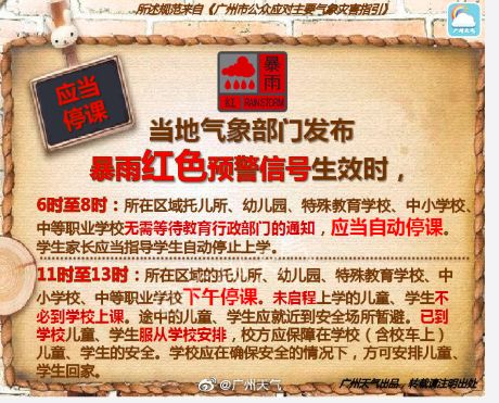 当暴雨红色预警信号生效时,所在区域的托儿所、幼儿园、特殊教育学校、中小学校、中等职业学校无需等待教育行政部门的通知,应当自动停课。学生家长应当指导学生自动停止上学。雷雨大风黄色预警信号生效期间学生可以延迟上学。