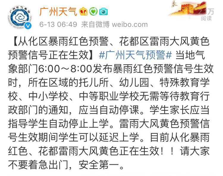 最新情况:6月13日早6点50分左右,广州气象部门发布:从化区良口、吕田从化暴雨红色预警信号生效中,从化全天停课。