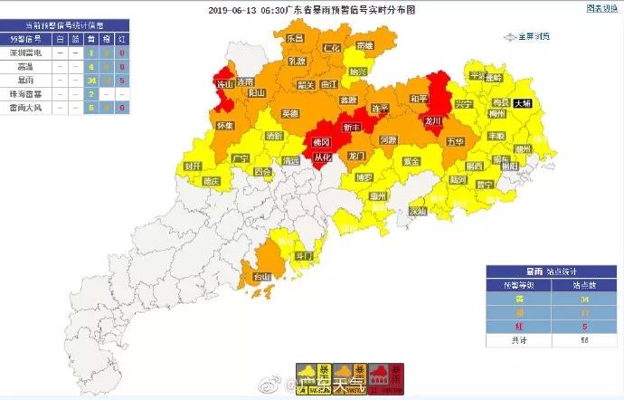 截至13日6时30分,暴雨橙色预警:台山、连南、阳山、怀集、英德、乐昌、仁化、南雄、乳源、韶关、曲江、翁源、连平、和平、龙门、河源、五华;