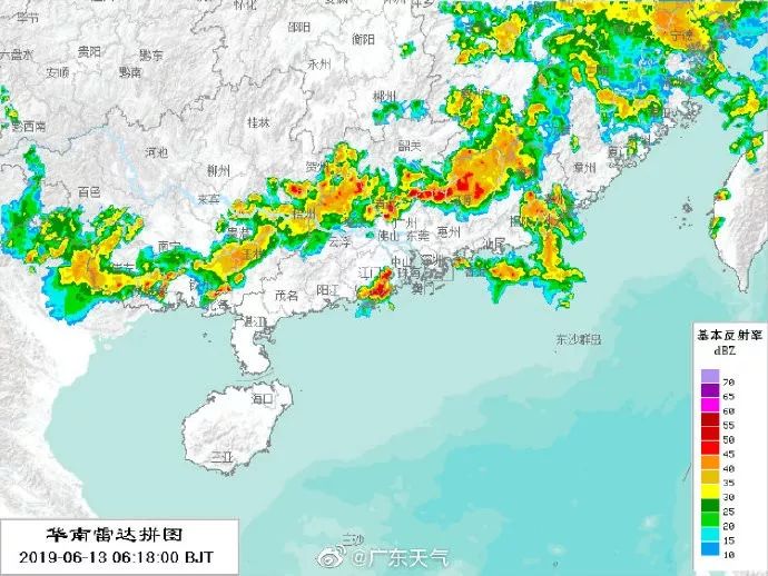 13日6日30分,从雷达图可见,强雷雨云系主要分布在肇庆、清远、韶关、河源、梅州一带,另外南部沿海和粤东市县有分散雷雨云团活动。