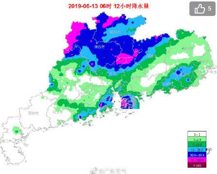 12日18时到13日06时,累积雨量较大的站点:从化区吕田镇129.5毫米;韶关新丰县梅坑镇152.5毫米、乐昌市长来镇141.5毫米、乳源县必背镇113.9毫米、仁化县城口镇109.4毫米;清远连州市瑶安乡洛阳墟147毫米、清新区太平镇146.5毫米、连山县禾洞镇140.7毫米、佛冈县水头镇126毫米、英德市沙口镇111.6毫米、连南县大坪镇109毫米;江门新会区沙堆镇141.9毫米;深圳南山区湾镇139毫米、内伶仃岛132.6毫米;惠州龙门县蓝田镇129.5毫米;河源龙川县麻布岗镇126.5毫米、和平县城区110.5毫米;肇庆怀集县蓝钟镇80毫;珠海斗门区莲洲镇71.6毫米。
