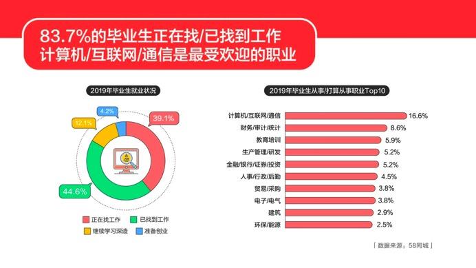 6月13日,21世纪经济报道记者获悉一份58同城发布的《2019年高校毕业生就业居行报告》显示,83.7%的毕业生处于正在找工作或已找到工作的状态,计算机/互联网/通信职业最受毕业生欢迎,一线城市仍然是2019年高校毕业生最热衷的工作城市。同时,高校毕业生找工作最关注薪资待遇,平均期望薪资为9154元,高于实际月薪6423元。多数毕业生选择毕业后立即找工作,对加班接受度高达93%。