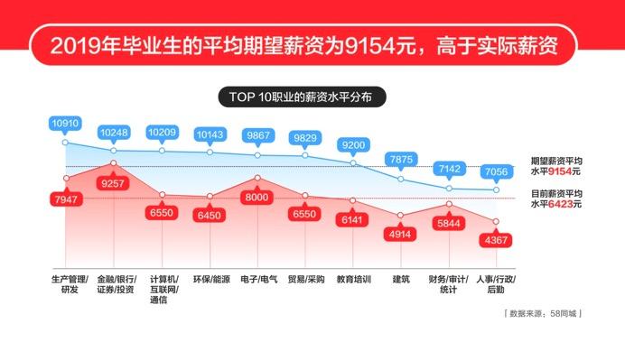 报告显示,2019年高校毕业生平均期望月薪为9154元,高于6423元的实际月薪。可见,高校毕业生对薪资有着较高的期许,但理想与现实仍存在一定差距。从最受关注的前十职业来看,金融/银行/证券/投资相关职业的薪资最高,达9257元,其次是电子/电气8000元,生产管理/研发7947元。