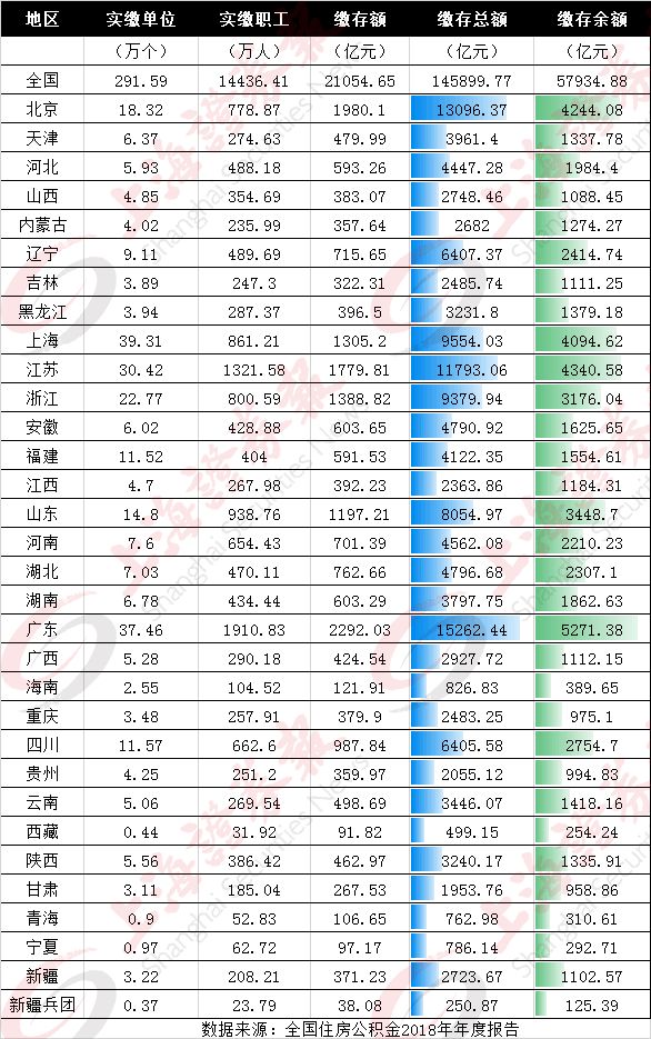 住建部、财政部、央行日前联合发布《全国住房公积金2018年年度报告》(以下简称《报告》)。《报告》显示,2018年,住房公积金实缴职工14436.41万人,住房公积金缴存额21054.65亿元。 分地区来看,2018年广东缴存额达到15262.44亿元,位列全国第一,北京缴存额13096.37亿元紧随其后,江苏11793.06亿元位居第三。广东缴存余额5271.38亿元,同样居于首位。 从提取情况来看,2018年,住房公积金提取人数5195.58万人,占实缴职工人数的35.99%;提取额14740.51亿元,其中,住房消费类提取11718.33亿元,占比79.50%。