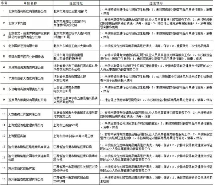 记者注意到,在专项整治期间查处的有多项违法情形的住宿场所经营单位名单中,包括汉庭、北京西苑饭店、新世界、格林豪泰等品牌。例如,位于北京市海淀区三里河路1号的西苑饭店,因未按照规定进行公共场所卫生检测、未按规定对顾客用品用具进行清洗、消毒、保洁而被查处。