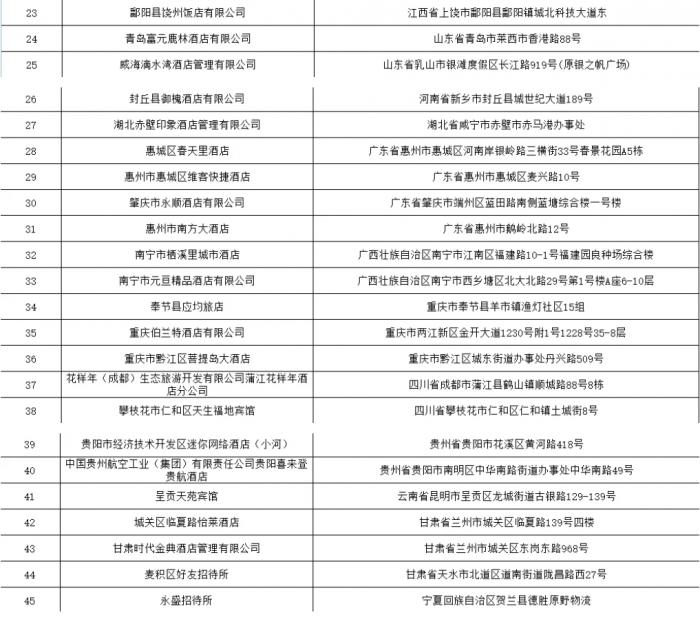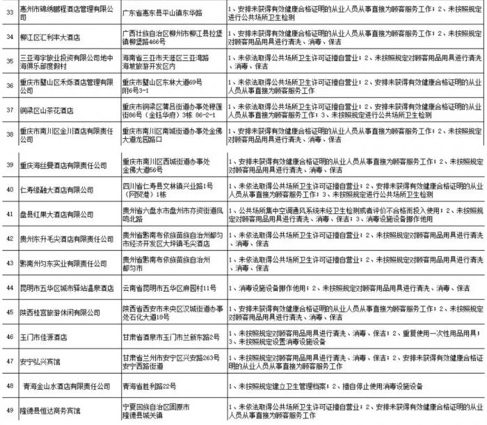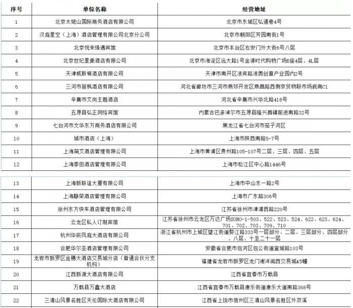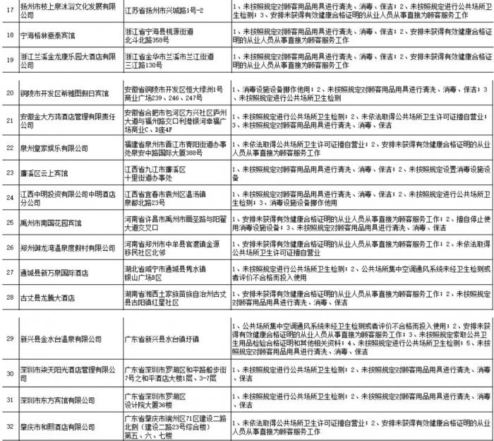 此外,国家卫健委还公布了2018年3月-2019年3月一年间多次违法受到查处的住宿场所经营单位名单,汉庭星空(上海)酒店管理有限公司北京分公司、三河市丽枫酒店有限公司等上榜。
