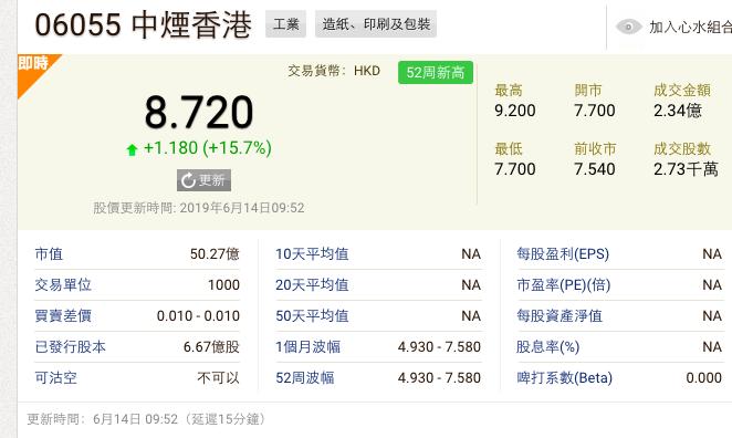 6月14日,中烟香港(06055)股价继续逆势走高,早间开盘后一路狂飙15.7%,最新报8.72港元/股,成交金额达2.34亿港元。按照中烟香港的招股价4.88港元/股,累计升幅逾78%。