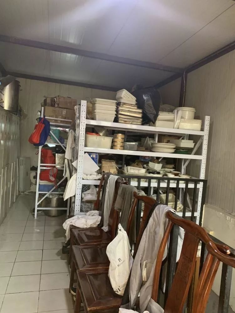 致美斋三楼餐具仓库同时为员工更衣室,餐具与员工衣物堆放在一起。