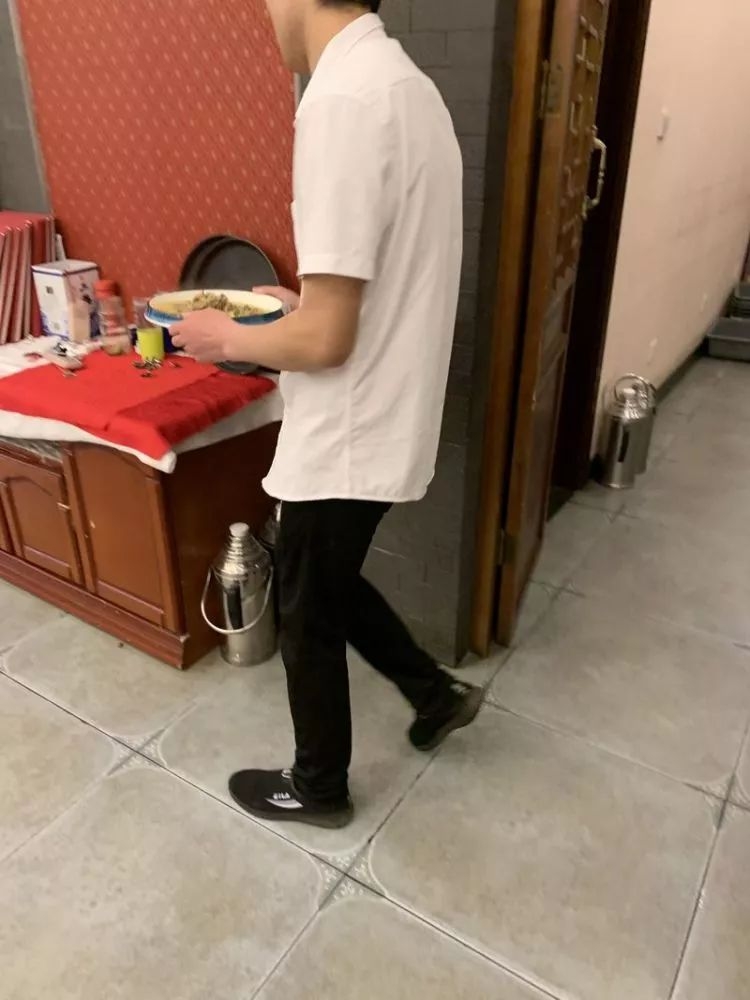 在传菜间,有员工直接拿起顾客外卖盒里的饭菜放入口中。未将菜品完全放到盘中的,传菜员就用手指直接将其拨回盘里。一些标有桌号和菜名的小票被厨师直接扔在食物上,服务员接过菜后再将小票从菜品里抓出,全程不用托盘。