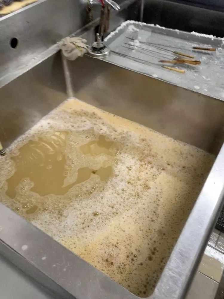 一楼洗碗间,已经被油污污染发黄的洗洁精水池。